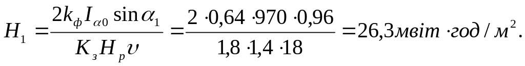 6. Обчислюємо експозицію (дозу) опромінення за 1 прохід опромінювальної установки Н1, мвіт·год/м2 за формулою