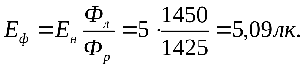 20. Оскільки нормована освітленість у приміщенні відповідає розрахунковому потоку визначаємо фактичну освітленість Еф, лк