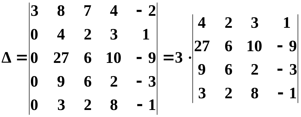 в отриманому визначнику 4-го порядку четвертий стовпець помножимо на 3 і додаєм до першого стовпця, потім помножимо його на 2 і додаєм до другого стовпця, помножимо його на 8 і додаємо до третього стовпця, отримуємо