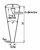 Заключается в подборе геометрических размеров вихревого реактора так, чтобы скорость восходящего потока в верхней части реактора составляла величину в пределах 4–6 мм/сек, угол φ между противоположными образующими конуса – в пределах 15–200; время пребывания воды в вихревом реакторе Т – 10–20 минут, высота реактора Н – не более 10 м. Ц