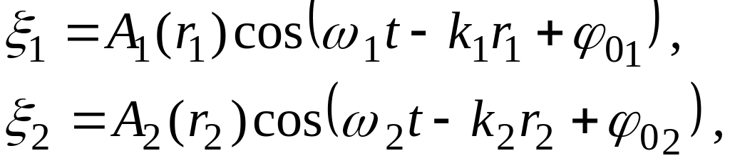 де 01 і 02 – початкові фази коливань джерел хвиль, r1 і r2 – відстані від джерел першої і другої хвилі до даної точки простору, 1 і 2 – циклічні частоти хвиль.