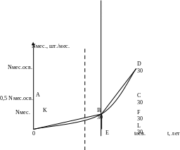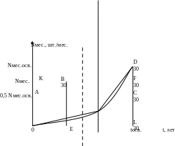Он соответствует неравномерному в период освоения нарастанию месячного выпуска — замедленному в начале и ускоренному в конце периода освоения. Площадь под кривой OBD (т. е. фигуры OBDL), как и площадь прямоугольника OKFL, равна общему количеству изделий Nосв, т. е. S0BDL = SOKFL. А поскольку фигура OBFL является общей для каждой из этихфигур, то, следовательно, площади заштрихованных фигур ОКВ и BDF также равны между собой. Уравнение кривой ОВ неизвестно, поэтому воспользуемся линейной аппроксимацией: участки кривой ОВ и BD заменим соответствующими отрезками. Абсцисса точки В (т. е. величина отрезка ОЕ на оси t) определяется из равенства площадей треугольников ОКВ и BDF: 0,5 • ОК • KB = 0,5 • BF • DF