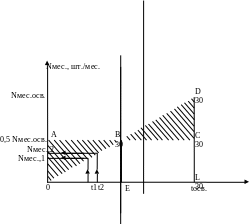 Это соотношение соответствует равномерному, т. е. пропорциональному времени освоения, нарастанию месячного выпуска изделий (рис.1). Очевидно, что общее количество изделий, изготовленных за период освоения tOCB(т. е. Nосв), равно площади треугольника ODL, а также площади прямоугольника OACL(так как ВС есть средняя линия треугольника ODL). Поскольку фигура OBCLпринадлежит как треугольнику ODL, так и прямоугольнику OACL, то, следовательно, площади треугольников ОАВ и BDCравны между собой. Среднемесячный выпуск изделий за время ∆t= t2–t1будет равен средней величине Nмесlи Nмес2, т. е.