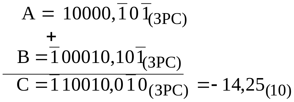 З таблиць виходить, що операції додавання і множення виконуються аналогічно звичайній двійковій системі числення, але тільки з урахуванням знака цифри розряду.