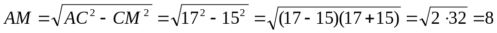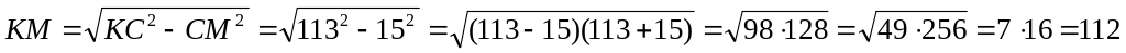 Известны стороны AC = 17 , CK = 113 и высота CM = 15 этого треугольника. Из прямоугольных треугольников ACM и KCM находим, что: