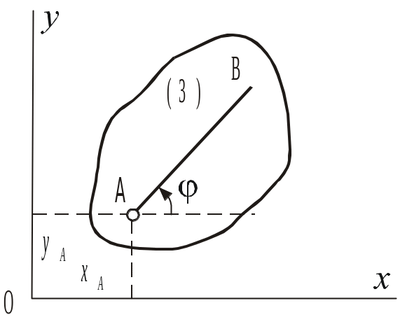 Как известно, плоскопараллельным называется такое движение твердого тела (звена), при котором каждая его точка все время движется в одной и той же плоскости. Положение звена на плоскости (для определенности возьмем плоскость XOY) задается положением какого-либо проведенного на этом звене отрезка АВ. В свою очередь положение отрезка АВ можно определить, зная координаты xA и yB точки А и угол φ, который отрезок АВ образует с осью Оx . Точку А, выбранную для определения положения звена 3, будем в дальнейшем называть полюсом.