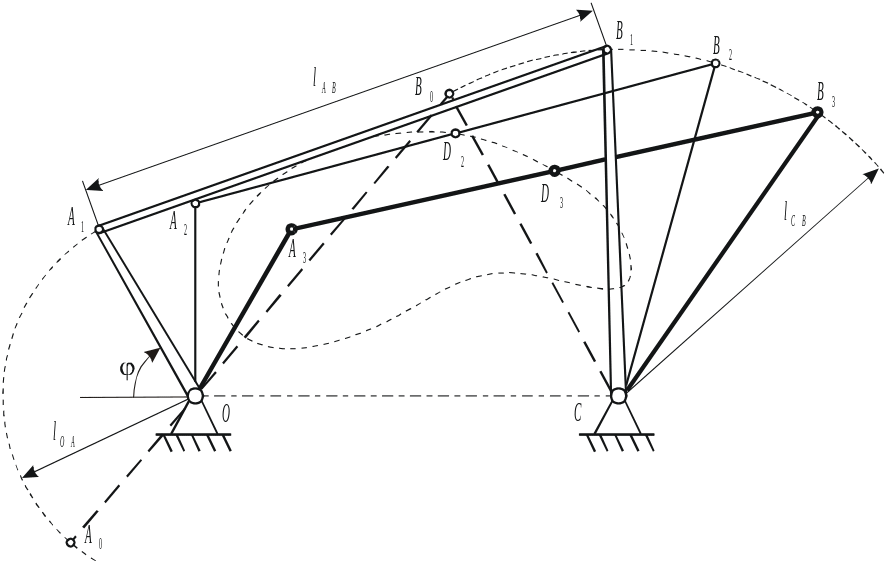 Пример: Требуется построить план шарнирного четырёхзвенника, если заданы lOA, lAB, lBC, lOC, ω = const.
