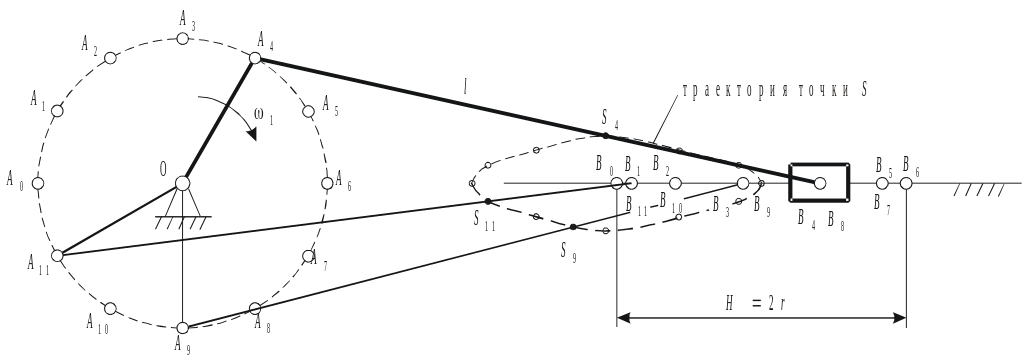На рис. 2.3 представлена схема построения двенадцати планов кривошипно-ползунного механизма, из которых выделено три, и траектория точки S.