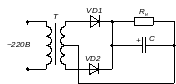 Схема однополупериодного выпрямителя приведена на рисунке 1.1. Такие схемы применяются в основном с емкостным фильтром и обычно рассчитаны на токи до десятков миллиампер. Преимущество таких выпрямителей – простота. К их недостаткам относятся: высокое обратное напряжение на диоде, большой уровень пульсаций, подмагничивание сердечника трансформатора постоянным током.