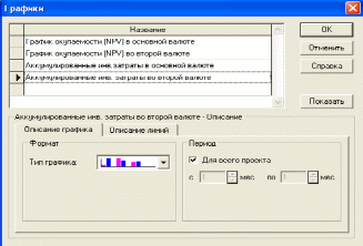 Нажать на кнопку Графики, выбирать название Аккумулированные инв. затраты во второй валюте. Нажмем кнопку Показать