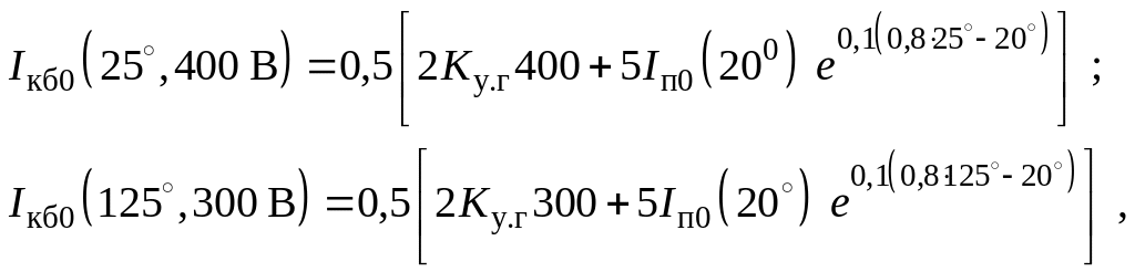 Решение системы уравнений дает следующие значения: Iп0(20ºС) = 0,52 мкА; Kу.г = 7,45 мкА/В, используя которые можно определить искомое значение обратного тока через переход коллектор–база при заданных значениях температуры перехода и напряжении коллектор–эмиттер. В результате получим