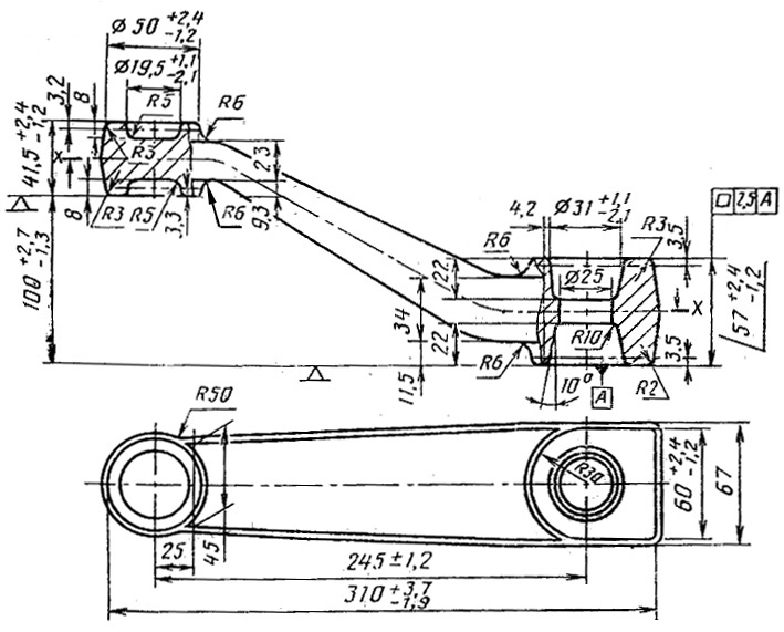 Деталь – рычаг (см. рис. 29); штамповочное оборудование – паровоздушный штамповочный молот; материал детали – сталь 12Х2Н4А (по ГОСТ 4543): 0,09-0,15% С; 0,17 – 0,3% Si; 0,30 – 0,60% Mn; 1,25 – 1,65% Cr; 3,25 – 3,65% Ni; масса детали – 3,30 кг.