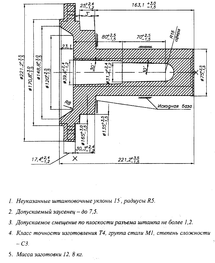 На чертеже можно не указывать размеры для построения линии разъема, припусков и напусков, а также рекомендуется избегать расстановки размеров от линии разъема, если она не совпадает с осевой. Необходимо указывать установочные базы для обработки резанием и от них проставить размеры с допусками. Размерные линии для нанесения размеров поверхности с уклонами проводят от вершины уклонов. Размеры поковки проставляют с учетом: