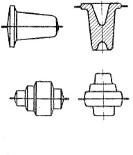 При штамповке КГШП получают поковки, более близкие по форме к готовой детали, более точные по размерам, чем при штамповке на молотах (рис. 39), а также поковки удлиненной формы (штамповка осадкой в торец, рис. 40), что упрощает линию разъема и конструкцию штампов. Для поковок, штампуемых выдавливанием, линию разъема обычно устанавливают по верхней наружной поверхности поковки.