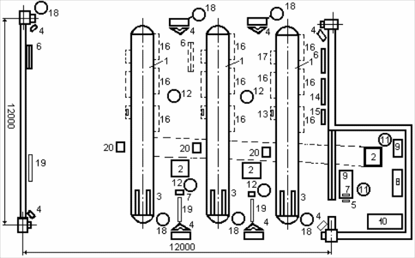 1 - контейнер для мусора; 2 - электротельфер; 3 - воздушная завеса; 4 - пульт управления; 5 - огнетушитель углекислотный; 6 - ящик для песка; 7 - пылесос; 8 - ларь для обтирочного материала; 9 - щит для инвентаря; 10 - барабан с самонаматывающимся шлангом и пистолетом для воды; 11 - знаки безопасности; 12 - ворота механизированные; 13 - автоматическая установка; 14 - конвейер; 15 - воздухораздаточная колонка; 16 - стул подъемно-поворотный