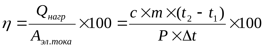 Рассчитать коэффициент полезного действия электронагревательного прибора (электрочайника) по формулам:
