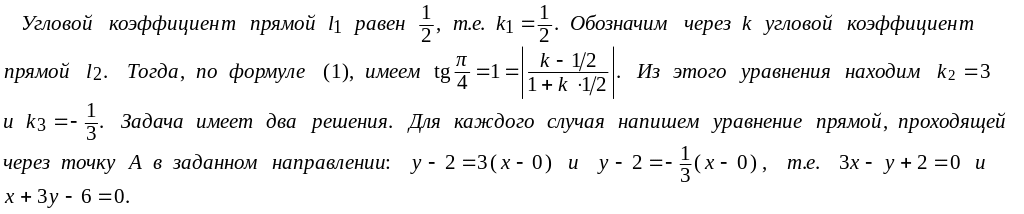 Пример 4. Написать уравнение прямой l 2, проходящей через точку А ( 0, 2 ) под углом /4 к