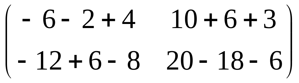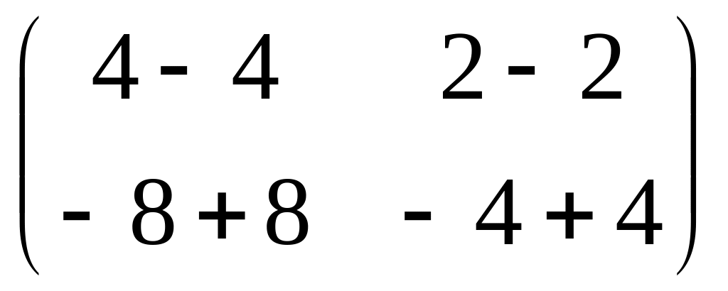 Как видно из этого примера, для матриц, в отличие от чисел, возможно, что получается нулевой объект в ответе, притом что в исходной матрице вообще ни одного нуля не было. Это из-за особенностей её строения: правый столбец в 2 раза меньше, чем левый, а нижняя строка в минус 2 раза больше, чем верхняя. И вообще, если взять пару матриц, где у первой будет пропорциональность строк (в k раз больше) а у второй - столбцов (в минус k раз меньше) получим такой же эффект.