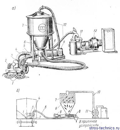Рис. 67. Вакуумная установка для разгрузки цемента а —общий вид; б — принципиальная схема
