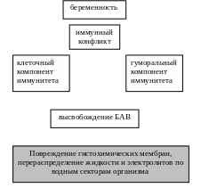 В итоге происходит аутоиммунное повреждение собственных тканей матери, аналогично тому, как это происходит при SIRS (systemic inflammatory response syndrome – синдром системной воспалительной реакции) без проявления инфекционного компонента (гипертермии, лекоцитарной реакции и т.д. ввиду отсутствия токсикоза, связанного с инфекционным агентом).