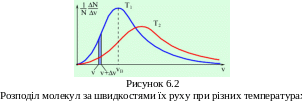 Як видно з наведеної формули, функція розподілу Максвелла залежить від температури газу, маси частинок і їхньої швидкості. На рисунку 6.2 представлені типові криві розподілу молекул за швидкостями. По осі абсцис відкладено модуль швидкості, а по осі ординат – відносне число молекул, швидкості яких лежать в інтервалі від v до v + Δv. Це число дорівнює площі виділеного стовпця. З графіку розподілу молекул за швидкостями можемо зробити наступні висновки.