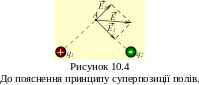 1. Установлює, що відбувається з полями, отриманими від кількох зарядів. Якщо поле утворене не одним зарядом, а кількома, то сили, що діють на пробний заряд, складаються за правилом додавання векторів. Тому й напруженість системи зарядів у даній точці поля дорівнює векторній сумі напруженості полів від кожного заряду окремо (Рисунок 10.4). Дане положення отримало назву «принцип суперпозиції полів».