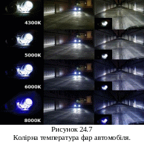 *Денним світлом вважається випромінювання з температурою 6500 К. Кольори з температурою нижче денного - теплі кольори (жовтуваті), вище - холодні (голубуваті)(рисунок 24.6). Колірна температура ламп розжарювання - 2800 ... 3200 К. Колірна температура блакитного неба - 9000 ... 15000 К. Колірна температура полум'я свічки - 1200..1700 К.
