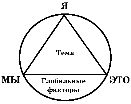Чтобы ориентироваться на процесс, не теряя из вида результат, многие тренеры работают с системой контрольных вопросов, основанных на модели тематически центрированной интеракции или иначе – темоцентрированного взаимодействия (далее ТЦВ)28. Особенность данной модели состоит в том, что она отражает динамику межличностного взаимодейс- твия вокруг темы. Любое образовательное мероприятие в неформальном секторе фокусирует определенную тематику и предполагает взаимодействие индивидов, поэтому модель ТЦВ получила широкое распростране- ние в данной сфере. Согласно данной модели, семинар можно графи- чески представить в виде вписанного в круг треугольника с четырьмя элементами: