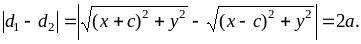 Если разместить фокусы гиперболы на симметрично началу координат в точках и , обозначить расстояния от произвольной точки на гиперболе до фокусов и , а модуль их разности положить равным , то можно выписать условие для составления уравнения гиперболы в декартовой системе координат: