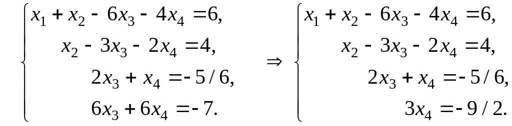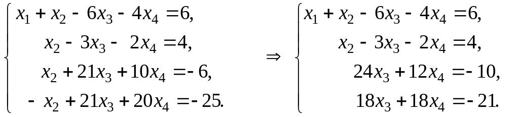 Предварительно разделив обе части второго уравнения на (-4), прибавим его к четвертому уравнению, умножив на (-1), прибавим к третьему, тогда: