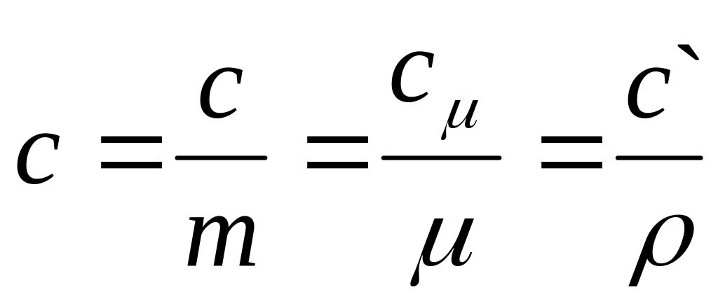 Питомою масовою теплоємністю сm (об'ємною сv ; мольною с ), віднесеною до 1кг газу (до 1м3 ; до 1 кмолю) зветься кількість теплоти, яку необхідно підвести (відвести) до одиниці маси речовини, 1кг (до одиниця об'єму, 1м3 ; до 1 кмолю речовини), щоб змінити його температуру на один градус.