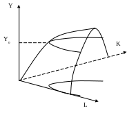Візьмемо точку Y0, яка відповідає рівню виробництва Y0=F(K,L). Проведемо через цю точку площину, паралельну координатній площині К0L. Ця площина перетинає поверхню графіка виробничої функції по кривій . Проекція лінії на площину K0L і буде ізоквантою.