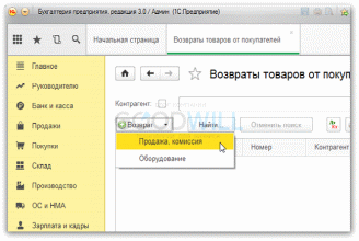 Чтобы провести в учете операцию возврата товаров или ГП (готовой продукции) комиссионеру, нужно по кнопке Возврат выбрать пункт Продажа, комиссия.