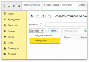 Чтобы провести в учете операцию возврата оборудования от покупателя, нужно по кнопке Возврат выбрать пункт Оборудование.