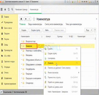 Если в наименовании группы допущена ошибка, то щелкнув правой клавишей мышки на строчку с группой откроем контекстное меню, где можно делать различные действия с данной строкой. В данном случае нужен пункт «Изменить». При нажатии на него откроется та же форма создания (редактирования) группы, где можно произвести необходимые изменения и сохранить их. Если в списке уже есть группа «Полуфабрикаты» и «Заморозку» можно перенести туда. Для этого в контекстном меню есть пункт «Переместить в группу».
