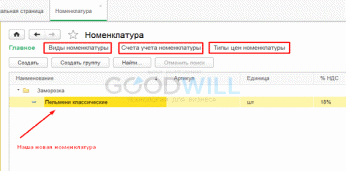 Переходим к созданию элемента номенклатуры. Так как мы хотим, чтобы «Пельмени классические» лежали внутри группы, щелкаем на ней два раза и попадаем внутрь.