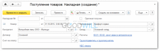Какой товар был куплен, в каком количестве, по какой цене и с какой ставкой НДС (если ваша компания является плательщиком НДС). Счета учета могут присутствовать в табличной части, а могут и нет. Это зависит от настроек программы. В проводках товар обычно приходуется на счет 41.01. На этом заполнение документ окончено.