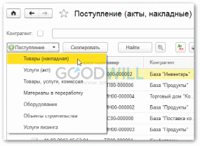 После этого мы попадаем в список документов, которые были введены. Для создания нового поступления, необходимо нажать на кнопку «Поступление», где появится меню выбора нужного вида операции: