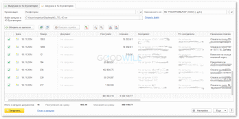 Мы увидим список документов 1с 8.3 «поступление на расчетный счет» и «списания с расчетного счета»: как входящие, так и исходящие (в том числе за услуги банка). После проверки достаточно нажать кнопку «Загрузить» - система автоматически сформирует нужные документы по списку с нужными бухгалтерскими проводками.