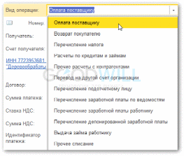 Платежное поручение - документ для отправки его в банк, его можно распечатать по стандартной банковской форме. Вводится на основании Счета, Поступления товаров и услуг и других документов. Документ не вырабатывает проводки бухгалтерского учета. Проводки создает следующий в цепочке документ - «Списание с расчетного счета». Чтобы создать новый документ зайдите в журнал «Платежные поручение» указанного выше раздела и нажмите кнопку «Создать». Откроется форма нового документа. Первое, с чего необходимо начать - выбор вида операции. От этого зависит выбор будущей аналитики: