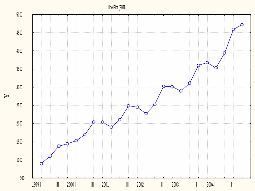 В качестве исходных данных используем квартальный ряд динамики ВВП (приложение Р, таблица Р.2) с 1 квартала 1999 г. до 4 квартала 2004 г.