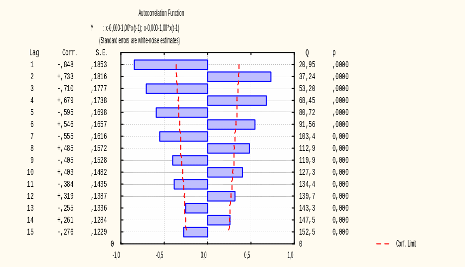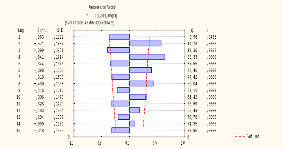 Шаг 2. Для построения автокорреляционной функции необходимо выбрать кнопку Autocorrelations (Автокорреляция), при этом можно регулировать уровень значимости, указывая соответствующее значение в окне p-level for highlighting. В результате проведения процедуры получаем график представленный на рисунке 7.6.