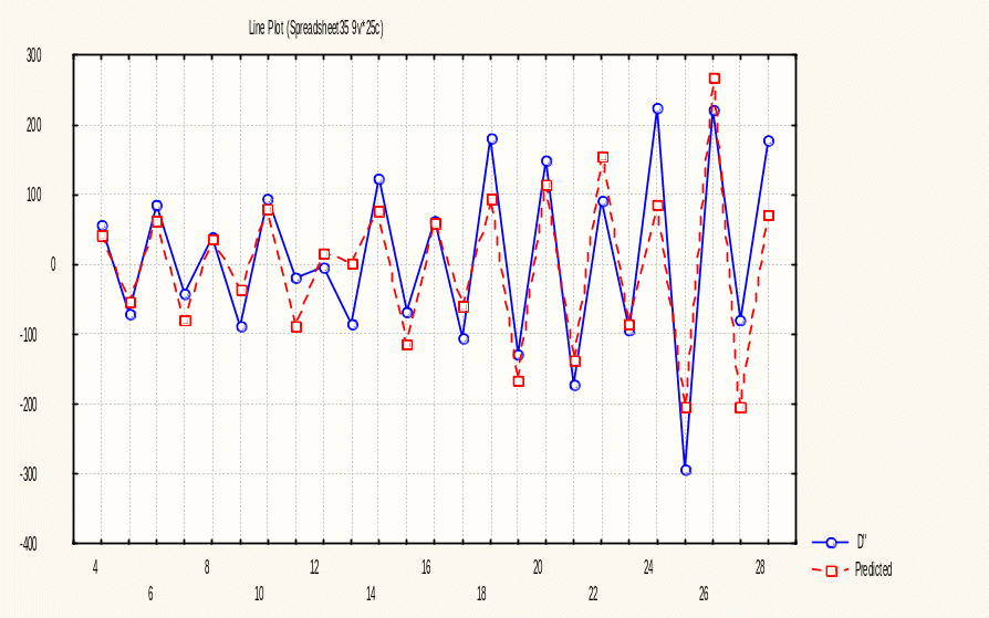 Шаг 7. На основе полученной таблицы построим график. Выберем в главном меню Graphs 2D Graphs Line Plots (Variables…). Нажмем кнопку Variables (Переменные) и в появившемся окне укажем переменные D’’ и Predicted. Также в поле Graph type (окно 2D Line Plots –Variables) выделим Multiple (таким образом, на график будет выведены обе переменные одновременно).