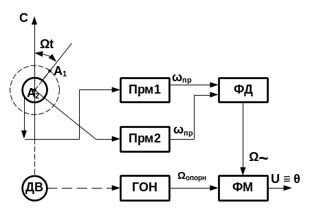 Антенная система АРП состоит из неподвижной антенны А2 и, вращающейся вокруг неё по окружности радиуса r, антенны А1. Так как антенна А1 при вращении циклически приближается и удаляется от источника радиоизлучения, то возникает эффект Доплера, вызывающий фазовую модуляцию принимаемого сигнала. Принятые сигналы несущей бортовой ОВЧ радиостанции после усиления и преобразования на промежуточную частоту поступают на фазовый детектор (ФД), где выделяется низкочастотное колебание Ω~, несущее в своей фазе информацию об угле пеленга. Для отсчёта пеленга относительно северного направления меридиана в схему введён генератор опорного напряжения Ωоп.