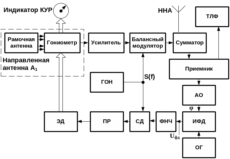 Сигнал приводной радиостанции, принятый антенной А1, подвергается балансной амплитудной модуляции НЧ напряжением от генератора опорного напряжения (ГОН) и подаётся на сумматор, где складывается с сигналом, принятым ненаправленной антенной (ННА).