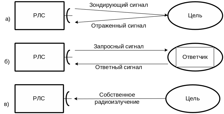 активная радиолокация с пассивным ответом (первичная радиолокация) (рис.2.7а);