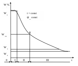Кривая сушки (рис. 1) показывает изменение влажности по времени. Как видно, из графика, весь период сушки от начальной влажности Wн до конечной W2 можно разбить на три периода: краткий период: подогрева материала, когда влажность его практически не изменяется; период постоянной скорости сушки, когда кривая сушки имеет форму наклонной прямой; и период убывающей (падающей) скорости сушки точки К. Точка К называется критической и фиксирует на графике момент, когда количество влаги, поступающей к поверхности материала, становиться меньше, чем может испариться с его поверхности.