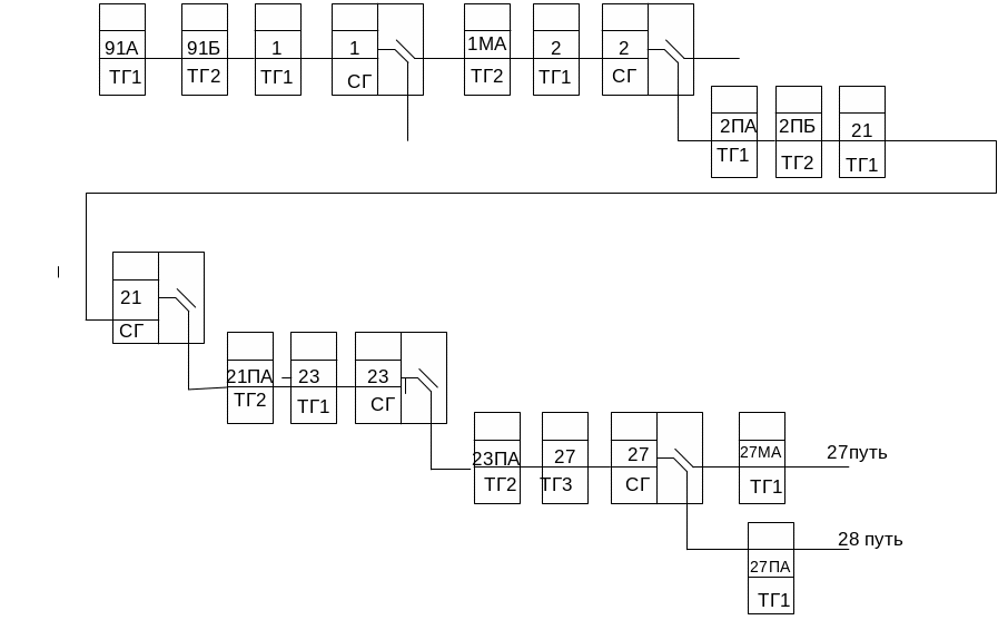Для ответа на вопрос 31-40 следует, изучить принцип осуществления трансляции задания роспуска в системе горочной автоматической централизации с контролем роспуска отцепов (ГАЦ-КР). Необходимо описать теоретически принцип построения блочного плана трансляции задания в системе ГАЦ-КР. При составлении плана трансляции задания следует учитывать чередование типов блоков для установки. План составляется по заданию для двух путей определенного пучка сортировочной станции . План станции представлен на рисунке 8. В соответствии с планом сортировочной станции составить для заданного пучка пострелочный код положения стрелок при роспуске. В таблице кодов плюсовое положение стрелки обозначается цифрой «1», минусовое положение стрелки по маршруту цифрой «0», если стрелка не задействована в маршруте , ее положение не учитывается, в таблице проставляется прочерк «-«.