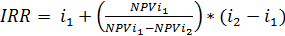 Для реализации инвестиционного проекта получены банковская ссуда, значение IRR показывает верхнюю границу допустимого уровня банковского процента, превышение которого сделает проект убыточным. При расчете IRR выбирается 2 значения i, при котором i2>i1, таким образом, чтобы в интервале i1….i2 функция NPV=f(i) меняло свое значение с + на – или наоборот.