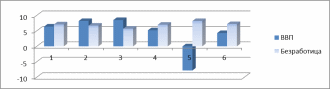 Рис 1. Графики прироста ВВП (в % к предыдущему году) и уровня безработицы с 2005 по 2010 г.г.